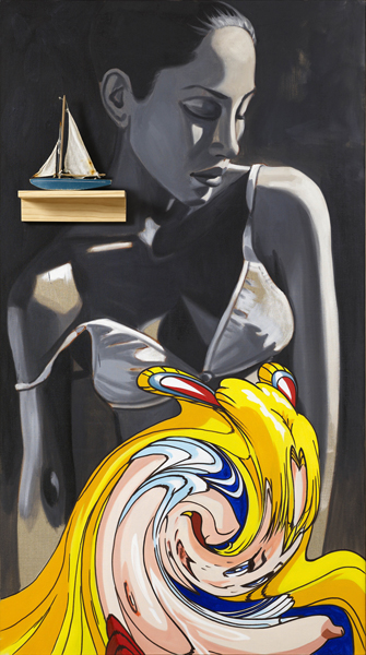 Sailor, 2007. Oil on linen with wood shelf and object. 72 x 40 inches. All images © David Salle/VAGA at Artists Rights Society (ARS), NY. For permissions and requests see contact page. >
